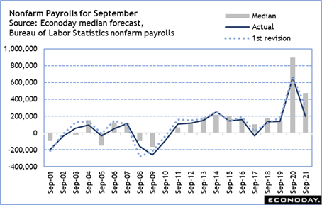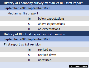 Historically, the forecast consensus for September payrolls strongly tends to come in below expectations and is just as likely to be revised higher in the October report.