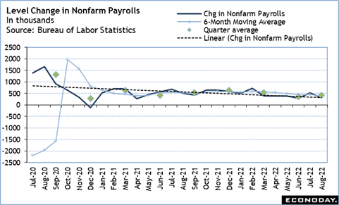 The September payroll numbers for the first two months of the third quarter are averaging 421,000 per month compared to 354,000 in the second quarter and 539,000 in the first quarter. Early estimates for nonfarm payrolls in September are running around 250,000. If this is about right, it puts monthly job gains right on track with the second quarter. This is a solid pace of job gains while suggesting that the labor market is coming into a better supply and demand balance.