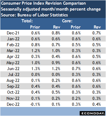 The BLS annual revisions to the CPI seasonal adjustment factors released on February 10 go back 5 years. The revisions don’t change the overall picture for the CPI performance in the last few years. Most of the revisions are small and offsetting on a month-over-month basis. However, it is notable that the CPI seasonally adjusted monthly percent change in the last three months of 2022 was higher than previously reported. The increases are minimal, but it does add a fresh bit of weight to Fed policymakers’ argument that inflation is not yet tamed and monetary policy needs to remain restrictive for a time.