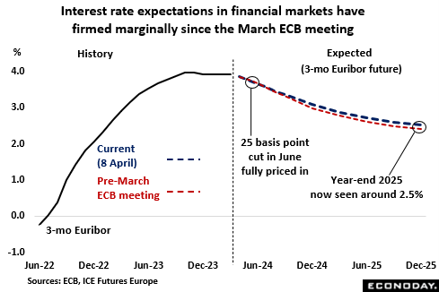 As it is, having been raised significantly between the January and March ECB meetings, interest rate expectations in financial markets have firmed a little more since. A 25 basis point cut is still fully priced in for June but additional easing thereafter is now only seen lowering 3-month money rates to around 2.5 percent by the end of 2025. This compares with about 2.4 percent previously.