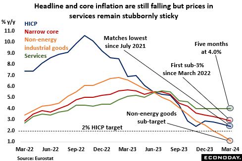 Inflation has behaved itself since the March meeting. The flash data for last month showed the headline rate falling again to 2.4 percent, matching its weakest level since July 2021 and just 0.4 percentage points above its medium-term target. More importantly, there was also good news on the core with the narrowest gauge dropping from 3.1 percent to 2.9 percent, its first sub-3 percent post since March 2022. However, inflation in services remains a problem. The rate here has held steady at 4.0 percent, double the target, every month since last November and with a near-45 percent weight in the HICP basket, poses a real threat to the bank’s price stability goals.