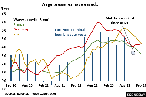 To this end, the ECB will want additional evidence that what is still a very tight labour market will not produce pay rises this year that might stall, or even reverse, the disinflationary progress made to date. Official Eurozone labour cost data are too historic to provide much insight into current developments – the first quarter update is not due for release until 17 June – but at least the trend over the latter half of 2023 was favourable. In fact, growth of nominal hourly costs in the fourth quarter hit its lowest mark since the end of 2021. In addition, Indeed’s more up to date monthly wage tracker has shown a marked deceleration in France, Germany, and Spain in recent months. All that said, current growth rates are still high in the context of a 2 percent inflation target and declining productivity so the bank will be hoping for further falls before its June meeting.