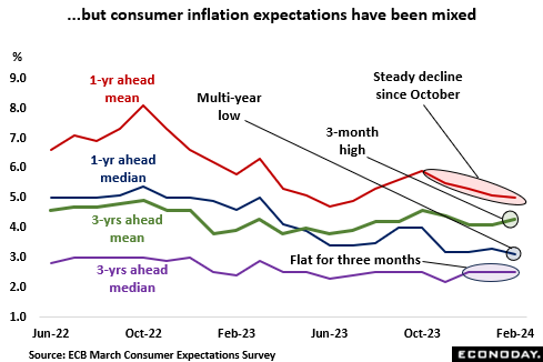 Meantime, the ECB follows inflation expectations very closely and, according to its own survey, recent developments in the household sector have been quite mixed. On the positive side, the latest results released last week found the trend decline in the mean 1-year view extending into February and its median counterpart hitting a multi-year low. However, the median 3-years ahead call has been stuck at 2.5 percent since December while the mean gauge is now at a 3-month high. Moreover, all measures remain well above the HICP target. This is unlikely to sit well with the GC hawks.