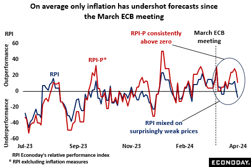 Significantly though, it has been inflation that has undershot market expectations since the March meeting. On balance, real economic activity has surprised on the upside as highlighted by Econoday’s inflation adjusted measure (RPI-P) which remained in positive surprise territory over the entire period. By contrast, the RPI, which includes inflation indicators, has been consistently weaker and on occasions below zero as forecasts of prices have proved too strong. This provides the perfect combination for the ECB inasmuch as it keeps open the door to an interest rate cut while at the same time limiting the pressure to ease potentially too soon.
