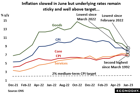 Headline inflation has fallen sharply since topping out at 11.7 percent last October and in June (7.9 percent) posted its lowest reading since March 2022. Moreover, favourable base effects, largely due to weaker energy prices, combined with lower import prices as supply chains flow more freely should see a further marked decline over coming months. However, more importantly, underlying inflation continues to prove a lot stickier and, at 6.9 percent last month, was the second highest since March 1992. Indeed, at its June meeting, the bank said there had been “significant” news suggesting persistently high inflation would take longer to fall. The MPC also noted that the key problem is the service sector where the current rate (7.2 percent rate) is also only just short of a 31-year peak. Inflation in the goods producing sector (8.5 percent) is significantly higher than its services counterpart but has declined fairly consistently and by fully 6.3 percentage points since peaking also in October 2022.