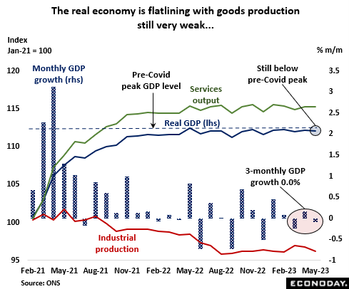 The ongoing tightness of the labour market masks a real economy that has all but stagnated so far in 2023. Real GDP in May was just 0.3 percent above its level last December while quarterly growth was zero. The extra bank holiday for the Coronation of King Charles III on 8 May probably had a negative effect but with some service providers benefitting from increased demand, the net impact is likely to have been minor. Matching the pattern seen across the rest of Europe, goods producing industries continue to struggle with output declining in three of the last four months. According to the CBI, confidence in manufacturing in the July quarter improved for the first time in two years but shrinking order books and declining backlogs hardly bode well. The bottom line is that total output in May was still 0.4 percent below its pre-Covid peak in January 2020 and most leading indicators argue against any significant pick-up near-term. Against this backdrop, further rate increases will inevitably boost the risk of a recession in the second half of the year.
