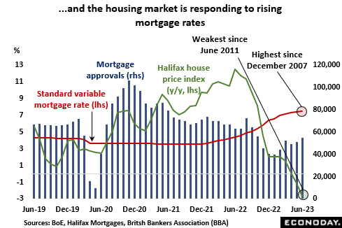 One area where higher borrowing costs are clearly slowing activity and, more obviously, dampening inflation is the housing market. Buyer enquiries have fallen to 8-month lows, mortgage approvals are well down from last August’s peak and, according to the Halifax’s gauge, house price inflation is the lowest in 12 years despite continued limited supply. Moreover, on some estimates, around 800,000 fixed-rate mortgage deals will need to be refinanced between now and the end of the year and a further 1.6 million in 2024. On average, new contracts are expected to cost an extra £2,900 a year. This leaves the housing market in danger of a sharp retrenchment that could add to the downward pressure on consumer spending already posed by tightly squeezed household budgets.