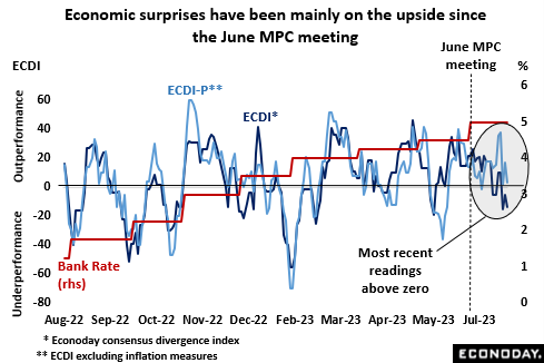 Even so, and despite the BoE’s aggressive tightening, overall economic activity has generally outperformed market expectations since the June MPC meeting. Indeed, although the ECDI (minus 14) has recently slipped below zero, its inflation-adjusted counterpart is still in positive surprise territory as it has been almost continually since the start of June. The unexpected buoyancy here gives the hawks extra ammunition should they want to shoot for another 50 basis point hike.