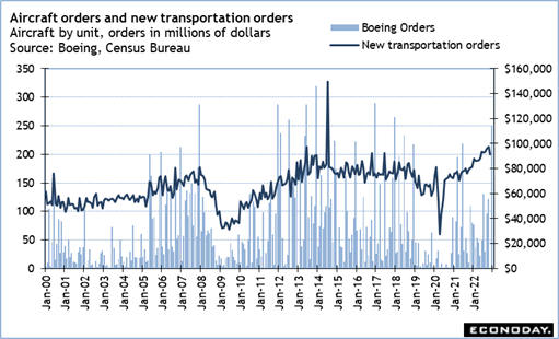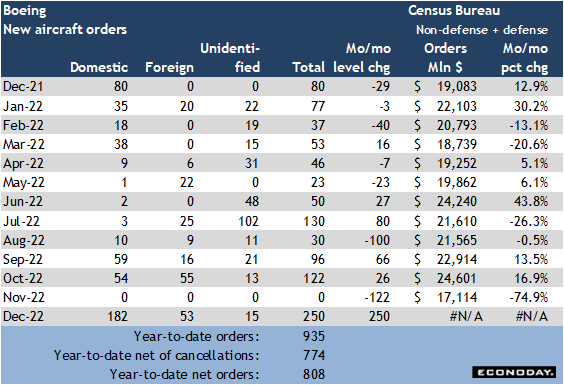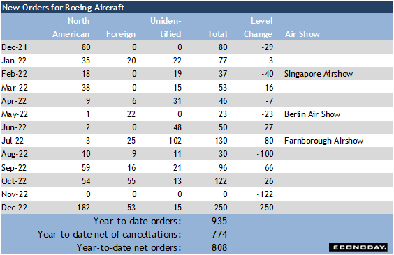 In December, Boeing received 182 new orders from North American buyers, 53 from foreign purchasers, and 15 from unidentified customers who are usually foreign military. The rebound in new orders lifts the outlook for the transportation component in the December advance report on durable goods set for 8:30 ET on Thursday, January 26. It should be noted that seasonal adjustment factors do look for strong aircraft orders in the final month of the year, but this should still boost the transportation component.