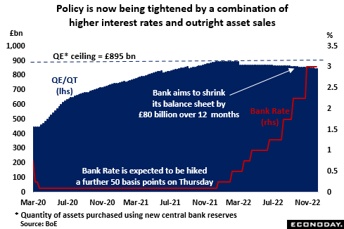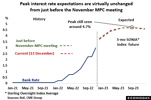 The bank should also update the progress made to date on reducing its bloated balance sheet. Disposals of corporate bonds began on 28 September and outright sales of gilts on 1 November, the latter a month late due to enforced emergency purchases used to support a collapsing bond market in late September/early October. As of 7 December, the overall quantity of assets financed by the creation of central bank reserves (QE) stood at £845.9 billion, down from a peak of just under £895 billion earlier in the year. The bank’s QT policy involves selling £10 billion of the gilts every quarter which, with around £40 billion of redemptions also falling due, would shrink the balance sheet by £80 billion over the year. The BoE will also look to offload its £19.3 billion of emergency purchases but sales here will be demand-led, with no fixed timetable so as not to unduly impact the market. To date, the introduction of QT seems to have had only a limited effect on bond yields.