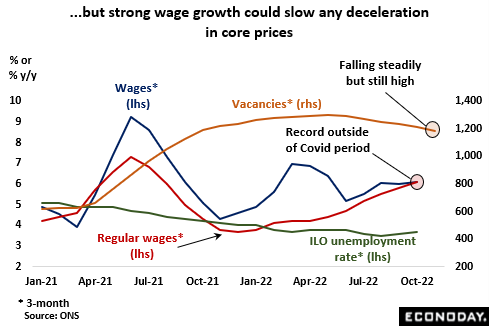 The real economy is almost certainly already in recession and, making matters worse, the downturn has begun with the economy still smaller than its pre-Covid peak in January 2020. October real GDP rose a respectable 0.5 percent on the month but that failed to reverse a 0.6 percent drop in September. The latter print was the worst since the 3.0 percent slump prompted by the Omicron lockdown back in January, albeit biased down by the holiday linked to the funeral of Queen Elizabeth II. October’s gain was only the second in the last five months and with 3-monthly growth at minus 0.3 percent, leaves intact a clear downward trend. In fact, compared with its trend growth rate before Covid, total output was short by almost 5 percent. The fourth quarter will also be hit by wide-ranging strikes, thought likely to cost the economy more lost working days than any time since 1989. Indicators of both business and consumer sentiment are at levels normally associated with contraction and with ongoing Brexit problems exacerbating a slowdown in overseas trade, avoiding negative growth this quarter will be very difficult.