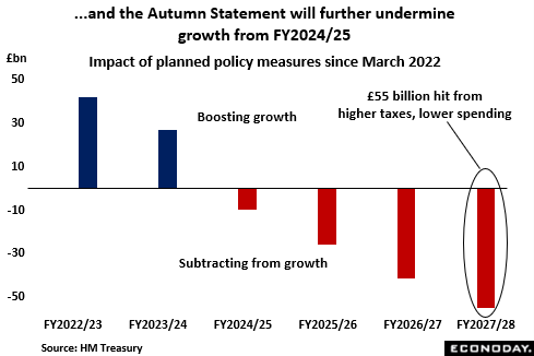 Meantime, even the government admits that the fiscal tightening contained in its new Autumn Statement will put significant additional downside pressure on economic activity and that with the independent Office for Budgetary Responsibility (OBR) already expecting GDP to shrink 1.4 percent in 2023. Planned net tax increases of some £54 billion by FY2027/28 should fill the hole in the financial accounts left by a combination of Covid, the war in Ukraine and rising inflation but it will also weigh heavily on spending and investment. Against this backdrop and compared with the March Budget, fiscal policy will actually be more supportive through FY2023/24 but beyond that, the hit to growth will build steadily as the UK’s tax burden reaches its highest level since 1948. As it is, the next couple of years are likely to be especially grim with real household disposable income seen slumping a record 7.1 percent to its lowest level since 2013. The OBR at least expects inflation to decline but the 9.1 percent and 7.4 percent rates projected for 2023 and 2024 respectively remain well above target.
