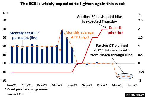 There may be differences over the desired size of any hike, but a concerted raft of hawkish comments from Governing Council (GC) members this month strongly suggests unanimity over the need for higher ECB interest rates on Thursday. The market consensus is for a second successive 50 basis point increase which, if correct, would put the deposit rate at 2.5 percent, the refi rate at 3.0 percent and the rate on the marginal lending facility at 3.25 percent. It would also boost the cumulative tightening since last July to some 300 basis points. Both a smaller, 25 basis point, or larger, 75 basis point increase cannot be ruled out altogether but nether seems particularly likely.