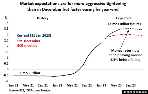 Reflecting the more hawkish tone to ECB rhetoric, market expectations for ECB tightening this year have become notably more aggressive than just before December’s policy announcement. From currently around 2.5 percent, futures now see 3-month money rates peaking at about 3.5 percent in September, up from 3.0 percent previously. However, steeper rate hikes in the first half of the year are also expected to pave the way for a slightly faster pace of easing later. A 25 basis point cut in key rates is now largely priced in by March next year and money rates are predicted to slide to around 2.80 percent by December 2024.