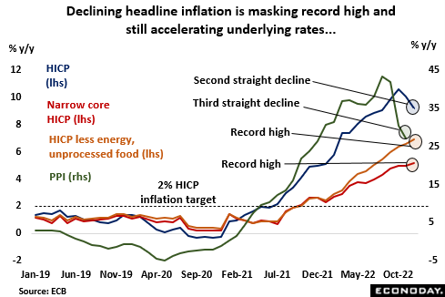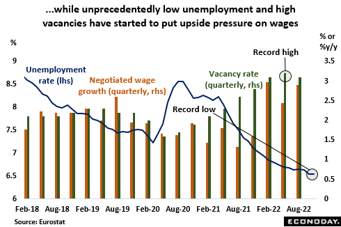 However, even though underlying inflation is still rising, any effect on the wages market has so far been quite limited. Official data from Eurostat are only quarterly and tardy but at 3.1 percent in the third quarter of 2022, annual negotiated wage growth was relatively subdued. This was down from the previous period’s record high, albeit still the second strongest reading to date. An ECB survey last quarter found non-financial companies expecting to raise pay around 4 percent this year, well below the current headline and core inflation rates. Even so, there are upside risks as the labour market is ominously tight. The unemployment rate in November matched October’s record low and third quarter vacancies were only just short of their historic peak. Indeed, the ECB’s experimental wage tracker currently points to a substantial pick-up wage growth over the next few quarters.