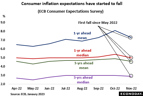 Such risks will become all the more elevated should possible second-round effects of rapidly rising prices not be kept under control and this means inflation expectations must remain anchored. On this front the latest news has been cautiously positive. According to the ECB’s own survey (based on a sample of about 14,000 adults in six of the Eurozone’s biggest countries) median consumer expectations for the next 12 months fell from 5.4 percent in October to 5.0 percent in November and for the next three years dipped a tick to 2.9 percent. Both gauges remain uncomfortably far above the 2 percent HICP target but this was the first decline for each since last May. Moreover, household inflation expectations in the EU Commission’s January report eased for a fourth successive month and now stand below their long-run average.