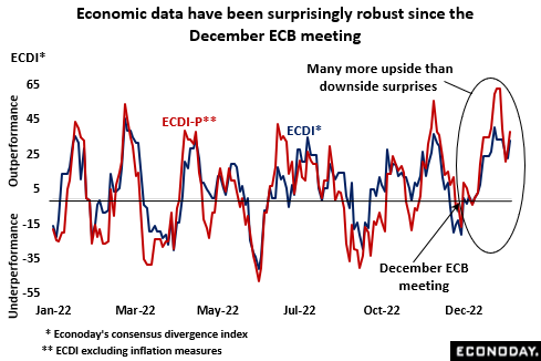 More generally, while clearly slowing, the Eurozone real economy has surprised almost wholly on the upside since the December ECB meeting, notably so in the data released so far this month. Econoday’s consensus divergence index (ECDI), which measures how overall economic activity has been performing versus market expectations, and the ECDI-P, which omits inflation surprises, have been well above zero since early January and were very recently at near-record levels. With fourth quarter GDP eking out a 0.1 percent quarterly rise, such strong readings have led some GC members to dismiss the chances of even a shallow Eurozone recession this year and probably all but rule out a smaller 25 basis point hike on Thursday. However, they certainly help to clear the path for another 50 basis point increase.