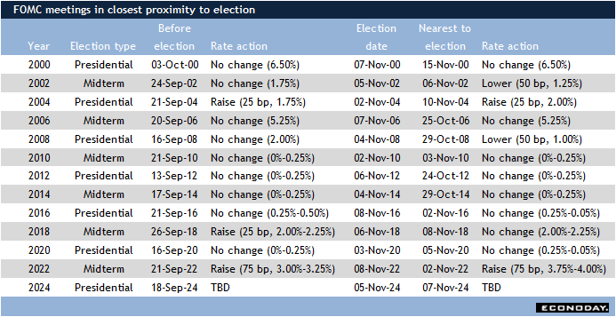The FOMC meets eight times a year at roughly 7-8 week intervals. It just so happens that the 6th and 7th meetings of the year fall within the final weeks of election season. Sometimes the normal Tuesday start of the two-day FOMC meeting is the same day as election day, as it is this year. In this case, the FOMC will shift the meeting to a Wednesday start to avoid any perception of political bias.