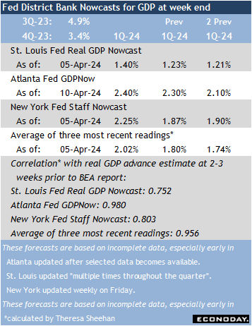 The three Fed district bank GDP nowcasts for the first quarter 2024 are fairly consistent in anticipating the advance estimate of real GDP set for release at 8:30 ET on Thursday, April 25. At 2-3 weeks from the release date, nowcasts tend to be set with little chance of much change. At this point the forecasts include the all-important employment report for all three months of the quarter.