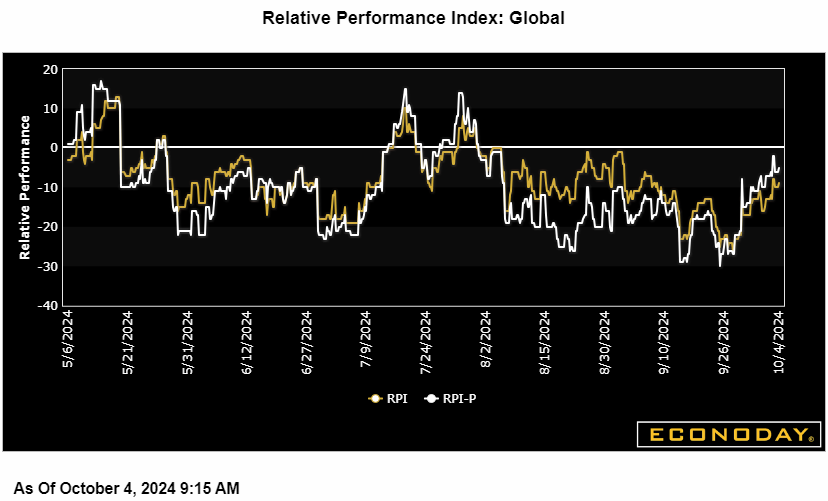 At minus 8, Econoday’s Relative Economic Performance Index (RPI) continues to show recent global economic activity lagging market expectations, but not by much. China in particular remains a significant drag, but Eurozone readings have improved and the U.S. continues to outperform.