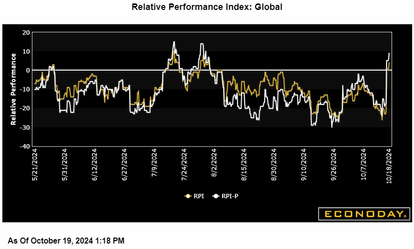 For the first time since early August and mainly due upside surprises out of China, Econoday’s Relative Economic Performance Index (RPI) last week climbed back above zero. However, at just 4, the index only shows recent global economic activity broadly matching market forecasts.