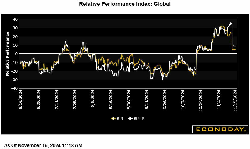 Econoday’s Relative Economic Performance Index (RPI) lost some ground last week but, at 8, still shows global economic activity running a little ahead of market forecasts. The U.S., Eurozone and Japan are all modestly outperforming expectations while the UK, Canada and Switzerland struggle to keep up.