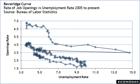 The July numbers on job openings and labor turnover (JOLTS) are at 10:00 ET on Tuesday. These data lag much of the other jobs data by a month but should still have something to say about what businesses are doing with all those job openings. Are they finding workers and hiring? Are they eliminating unfilled positions? Are workers still confident enough to leave one job for another? The Beveridge Curve – which compares the rate of job openings to the national unemployment rate – should show if conditions are starting to display a more balanced state between available jobs and the supply of labor.