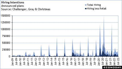 The Challenger numbers on layoff intentions for August at 7:30 ET on Thursday will also help shape perceptions of the labor market. So far there have not been widespread layoff plans even as the economy slows. The data on hiring intentions may include the first wave of plans to add seasonal workers for the upcoming holiday season. Plans for 2022 are likely to be modest given the shortage of labor. Retailers may be intending to only hire limited numbers of temporary workers out of concern for a sharper downturn in the economy. There is also the issue of whether stores are going to have the inventory to power holiday sales events. Lean shelves may push more shoppers online. Delivery services are likely to see a need for extra help in the coming months.