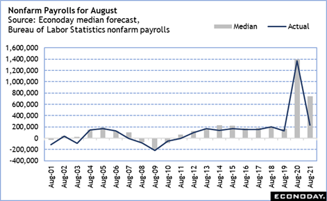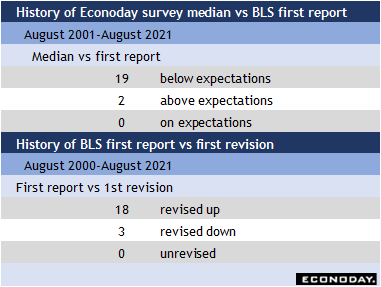 On Friday at 8:30 ET, the Bureau of Labor Statistics will release the August employment situation. Early estimates for nonfarm payrolls are around the 300,000-mark. Keep in mind that the July report had a big upside surprise. It is possible that the August number will be weak in comparison. The history of the median expectation in Econoday’s surveys for August payrolls shows that it consistently comes in below the consensus, although this is also almost always revised higher in the subsequent report. If there is a downside surprise in August, it should be taken as payback for an oversized increase in the prior month.