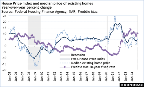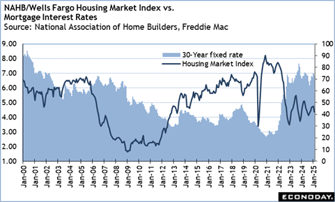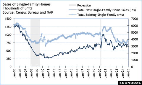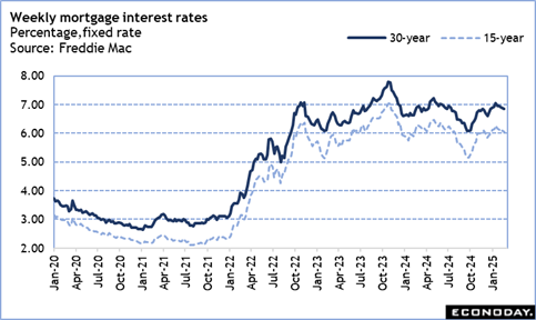 The housing-related data in the week will not clarify the picture. The FHFA house price index and the Case-Shiller home price index on Tuesday at 9:00 ET are both for December. These will confirm the broad moderation in home prices up through the end of 2024, but not what effect conditions in January had on prices.