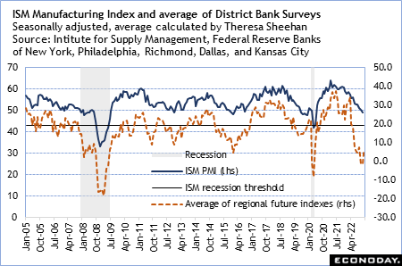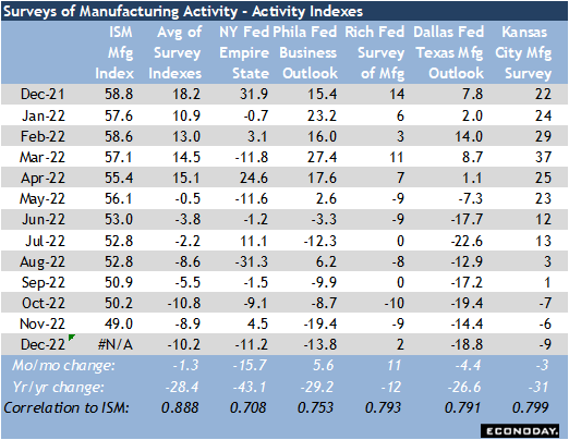 The ISM Manufacturing Index for December will be released on Wednesday, January 4 at 10:00 ET. There have been hints of moderation in the decline in factory sector activity from November, but overall the ISM index is likely to remain mired just below the neutral mark, but not quite into recessionary territory.