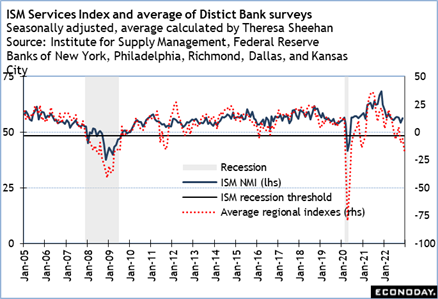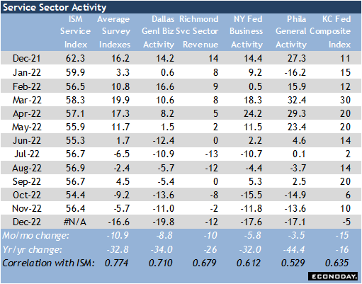 On the other hand, the ISM Services Index for December at 10:00 ET on Friday, January 6 could well show conditions in the service sector have deteriorated since the November report. The five District Bank surveys of manufacturing all point to weaker conditions. Services may not be quite in recession either, but definitely are expanding more slowly.