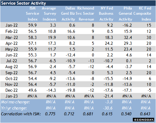 In any case, most of the data that will substantially influence the outcome of the FOMC decision have already been published. The only new reports that might have an impact are the regional Fed surveys of manufacturing and services for January. Already reported was the New York survey for manufacturing (Empire State) which showed an outsized drop while service sector data remain in contraction. Then the Philadelphia Fed survey for manufacturing told a more positive story, although its factory sector is slowing. In the coming week, the Philadelphia Fed will release its survey of the service sector at 8:30 EST on Tuesday. The Richmond Fed’s surveys of manufacturing and services will be reported at 10:00 EST on Tuesday. The Kansas City Fed’s manufacturing survey will be at 11:00 EST on Thursday and service sector survey at 11:00 EST on Friday. If these back up the data that the factory sector is moving into recession and that activity in services is continuing to slow, it might give Fed policymakers another reason to reduce the size of the next rate hike to 25 basis points after the 50 basis points in December. The FOMC will have evidence that inflation is improving – if still too high – and incorporate lagged effects of previous rate hikes into their policy outlook.