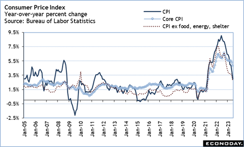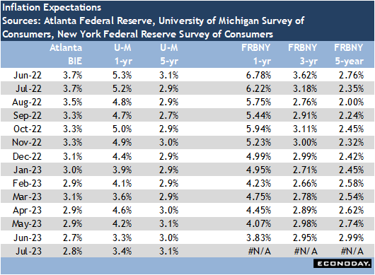 The FOMC won’t see the June data on their preferred measure of inflation until after the meeting. The report on personal income and spending includes the PCE deflator but won’t be released until 8:30 ET on Friday. However, June data showed the all-items CPI up 3.0 percent year-over-year, a sharp drop from 4.0 percent in May. The core CPI in June rose 4.8 percent compared to 5.3 percent in May. The CPI excluding food, energy, and shelter was up 2.7 percent from June 2022 compared to 3.4 percent year-over-year in May. The CPI report has a special aggregate for all services excluding rent that indicates prices for consumer services are relenting. This year-over-year pace in June slowed to 3.2 from 4.2 percent.