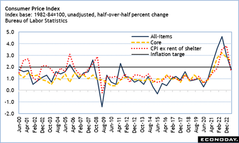 However, the pace of declines in inflation may have accelerated even more than the year-over-year measures suggest. If we look at the half-over-half percent changes in the all-items CPI compared to the Fed’s flexible average inflation target of 2.0 percent, the CPI is at up 1.8 percent in June compared to 3.0 percent in December and the near-term peak of 4.6 percent in June 2022. The core CPI is coming down less quickly, but it is nearing target at 2.5 percent in June 2023 compared to 2.8 percent in December 2022 and near-term peak of 3.2 percent in June 2022. Moreover, the CPI for services excluding rent is at 1.6 percent in June 2023 compared to its near-term peaks of 3.8 percent in December 2022 and 3.5 percent in June 2022.