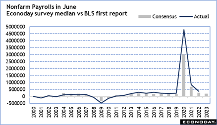The monthly employment report is expected to show some further slowing in the pace of hiring. A rough early consensus is for an increase of 200,000 in nonfarm payrolls in June when those numbers are released at 8:30 ET on Friday. This would put the average monthly pace at around 280,000 in the second quarter, a dip from the 317,000 average per month in the first quarter. This wouldn’t be a material drop and is quite similar to the monthly average of 264,000 in the fourth quarter 2022. It’s a consequence of the deficit in the supply of labor that despite slower economic conditions and risks to the outlook that businesses are still hiring.