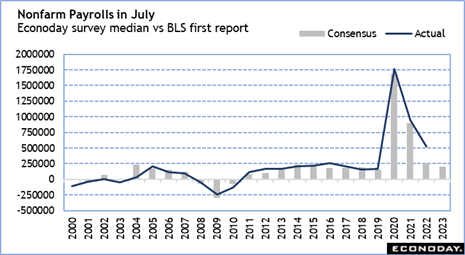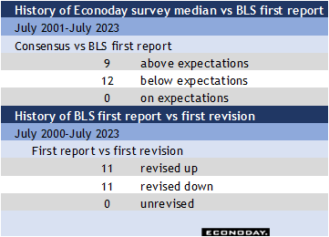 Historically, the July report for nonfarm payrolls tends to come in under expectation, although it is often revised higher in the subsequent report. Most forecasters are looking for slower payroll growth in July, so a report on the soft side may not be too big a disappointment.