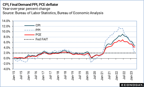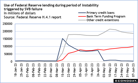 Also to be taken into account is if credit conditions have tightened sufficiently to do some of the work of another rate hike. The period of instability triggered by the failure of Silicon Valley Bank is not yet over if the lending data in the Fed’s weekly H.4.1 report is any indication. However, the data also indicate that banks are getting needed liquidity while they address their risk management problems. Other credit extensions – including loans to the FDIC – are falling, but not much, while use of the Bank Term Funding Program – implemented for this current problem – continues to see an increase in lending, albeit slowly.