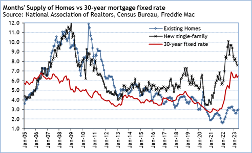 The other data reports to keep an eye on are those related to the housing market. Recent numbers suggest that housing bottomed out in late 2022 and regained some ground in early 2023 when there was a dip in mortgage interest rates. Potential homebuyers are still uncomfortable with higher borrowing costs where anything above 6 percent on a 30-year fixed rate mortgage feels massive compared to the historic lows in 2021 and 2022. However, the latest data point to lack of supply of existing homes at an affordable price as keeping sales numbers down. If higher rates have cooled the housing market, lack of supply means that those still looking to buy a home are in fierce competition for the more sought-after units.