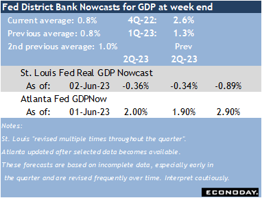 In the absence of significant data, Fed policymakers will heave a sigh of relief that a debt limit breach was averted and no longer weighs on the outlook for the economy or monetary policy. The May employment numbers, headlined by a strong 339,000 rise in nonfarm payrolls but balanced by a sharp uptick in unemployment to 3.7 percent, are consistent with a labor market that is reestablishing more balanced conditions while remaining able to absorb new workers, or offer possibilities to workers looking for new opportunities. Rising gasoline prices are an unwelcome reminder that inflation has not been tamed and will keep consumer confidence readings on the pessimistic side. Consumers and businesses will not be happy about tightening financial conditions and higher borrowing costs, but this doesn’t seem to be severely impacting spending.