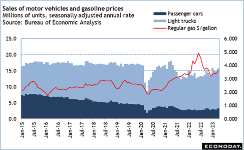 Early April could have seen an uptick in spending associated with the Passover and Easter observance period, although that seems to have faded quickly, at least for in-person shopping. It is possible that shopping online was strong. The increase in the pace of motor vehicle sales in April to 15.9 million units at an annualized rate compared to 14.8 million in March points to a likely boost for this category. Prices for gasoline were on the rise in April and only eased late in the month. The April average for regular gas was $3.603 per gallon compared to $3.422 in March. However, seasonal adjustment factors should take this into account as April prices typically rise in the changeover period to summer fuel formulations that have a deadline of May 1.
