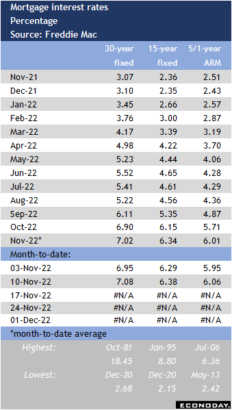 The NAHB/Wells Fargo housing market index for November at 10:00 ET on Wednesday should reflect the ongoing climb in mortgage rates that have decreased home affordability and pushed some homebuyers out of the market despite moderation in prices. Homebuilders have responded by reducing projects and focusing on more entry-level, less expensive units. This is also due to the limited inventories of existing units on the market as current mortgage holders – especially those who bought or refinanced in the last few years – are reluctant to sell even though home values have increased rapidly.