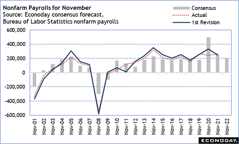 There are a number of labor market reports during the week that should reflect an easing in labor market conditions, from very tight to merely snug. Early estimates are a 200,000 rise for nonfarm payrolls and a 1 tenth uptick in the unemployment rate to 3.8 percent. This would represent a slowing in job gains, though still at a pace consistent with modest economic expansion and suggesting that the worst of the labor shortages are easing. Based on past results, Econoday’s nonfarm consensus is about as likely to come in above expectations as below, with the result subsequently revised higher.
