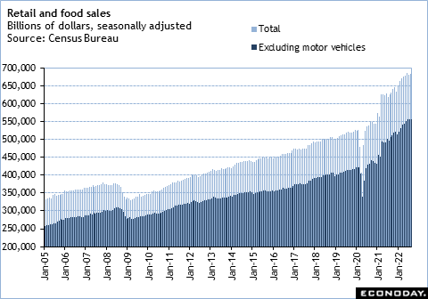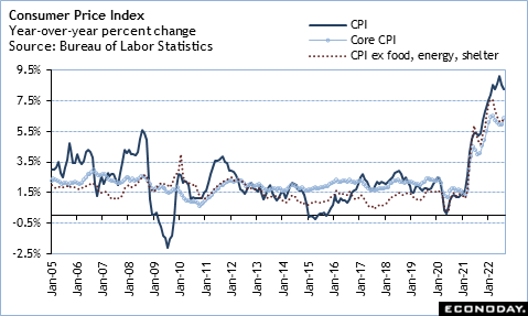 Three reports on inflation will be released in the week. Final-demand PPI is at 8:30 ET on Wednesday, the CPI is at 8:30 ET on Thursday, and import and export prices at 8:30 ET on Friday. The most watched of these is the CPI where Fed policymakers will be looking for any evidence that rate hikes are having an impact on demand-side inflation. Recent drops in energy have looked better for total prices than for the core – excluding food and energy. Various Fed officials have said they are concerned about the persistence of underlying inflation and that rate hikes will not stop until there is a “meaningful” and/or “sustained” decline in upward price pressures.