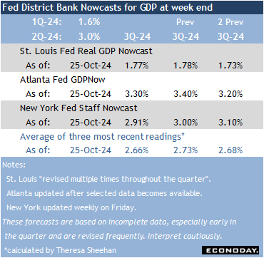 The advance estimate for third quarter GDP is at 8:30 ET on Wednesday. Growth of around 2.5 to 3.0 percent seems likely, which is little different from the up 3.0 percent in the second quarter. The three GDP Nowcasts from the New York, St. Louis, and Atlanta Feds forecast growth at 2.91 percent, 1.77 percent, and 3.30 percent, respectively. Historically, the Atlanta Fed forecast has the strongest correlation with the actual result. In any case, solid consumer spending should keep modest growth on track.