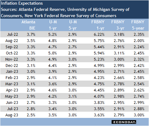 There will also be a look at early September inflation expectations in the Atlanta Fed’s business inflation expectation report at 10:00 ET on Wednesday, the University of Michigan survey of consumers at 10:00 ET on Friday. Recent months have seen some minor ups-and-downs in the numbers, but generally expectations are consistent with inflation coming back toward the Fed’s two target over time, but it may be a longer process than previously thought.