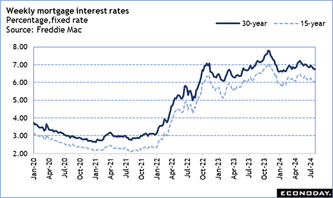The weekly Freddie Mac rate for a 30-year fixed rate mortgage has been below 7 percent since the start of June and has fallen as low as 6.73 percent in the August 1 week, its lowest since 6.64 percent in the February 8 week. The MBA data has not seen an increase in purchase applications since the July 5 week. It could simply be the summer doldrums and weaker demand at a time when fewer households are looking to relocate. However, it could also be that buyers who are not under pressure to find housing are anticipating further declines in interest rates and are willing to wait.
