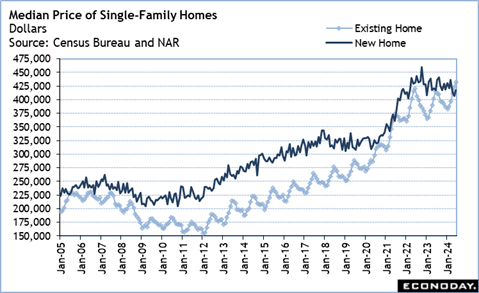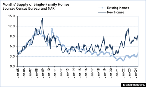 Another source of mortgage application is from refinancing. This has been quite low since many current mortgage holders have notes taken out when rates were considerably lower. Refinancing had a miniboom in the MBA data for the weeks of July 12 and July 19. It has since petered out, but there is a hint here of a potential wave of refinancing activity in the near future. Homebuyers from October-November 2023 who took out mortgages when the 30-year fixed rate was at its recent peak could shave as much as 100 basis points off the lending rate if they refinance now. There are also those buyers who opted for an adjustable-rate mortgage who would prefer to lock in a fixed rate that is much the same as the one on their current ARM note.