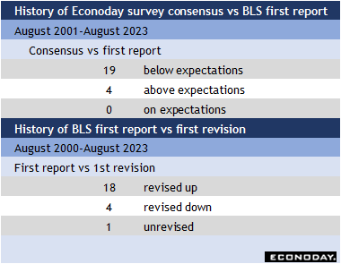 Some of these questions hinge on the contents of the monthly employment report for August when it is released at 8:30 ET on Friday. The July report presented a downside surprise with a payroll increase of 114,000 and a downward net revision of 29,000 to the prior two months, combined with a 2 tenths increase in the unemployment rate to 4.3 percent. The results sparked worries that the labor market was cooling more quickly than previously thought. A second below-expectations report could be more worrisome. However, it should also be noted that nonfarm payrolls frequently come in below the market consensus and are subsequently revised higher.