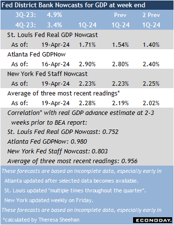 The highlight of the economic data calendar is the advance estimate of first quarter GDP set for release at 8:30 ET on Thursday. The three Fed district bank GDP Nowcasts point to growth something above the 2 percent-mark. Growth should get support from mainly personal consumption expenditures. The first quarter of the year often is the weakest, but this may not be the case in 2024.
